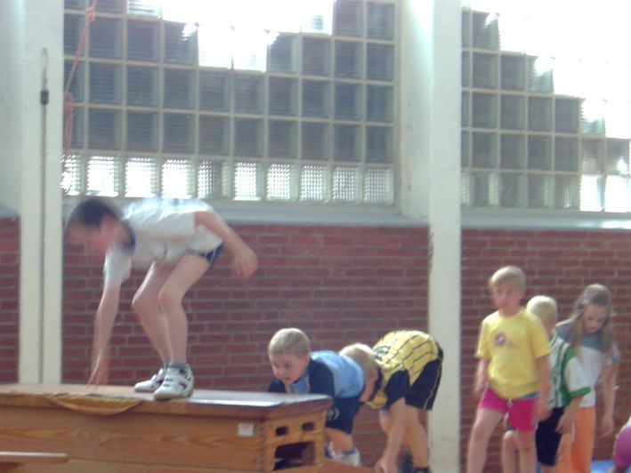 Mädchen und auch Jungen die bereits die Schule besuchen lernen hier die ersten Turnübungen. Rollen vor- und rückwärts, Handstand, Sprung über Bock und Kasten sowie Turnen am Reck und auf dem Schwebebalken soll erlernt werden.